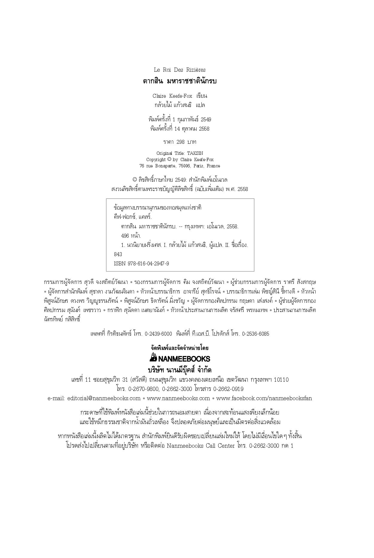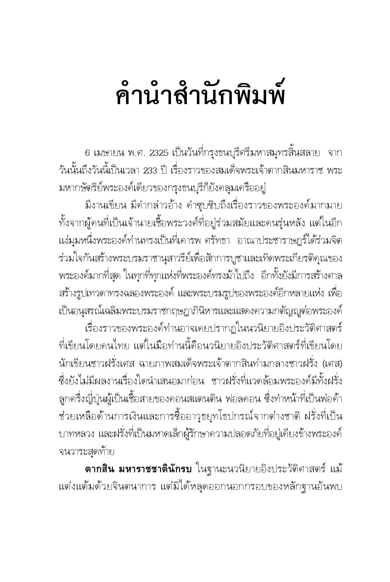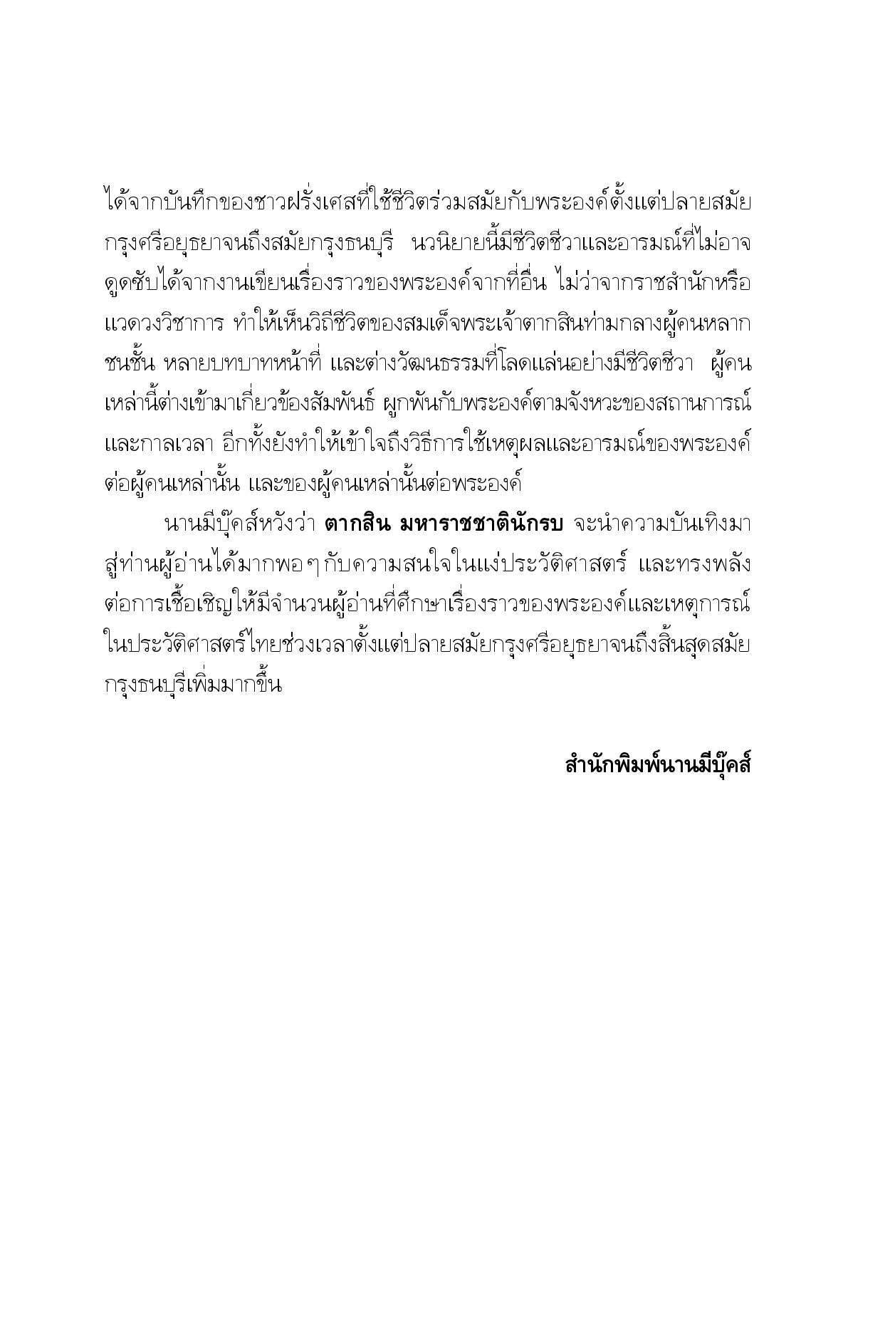 เรื่อง “จริง” ของพระเจ้าตากสินมหาราชที่ดัดแปลงเป็นนวนิยาย ร้อยเอก มาตีเยอ-ชาร์ล เดอ แกร์แอร์เว องครักษ์ของพระเจ้าหลุยส์ที่ 14 ผู้ถูกเนรเทศ ได้มาเริ่มต้นชีวิตในอยุธยาด้วยการเป็นลูกจ้างของตระกูลฟอลคอนซึ่งทำการค้า แต่เมื่อเขาได้รู้จัก สิน ที่ภายหลังกลายเป็นพระยาตาก ชีวิตของมาตีเยอก็เปลี่ยนแปลงไปโดยสิ้นเชิง เมื่อกรุงศรีอยุธยาล่มสลาย มาตีเยอกลายเป็นนายทหารผู้ใกล้ชิดและต่อสู้เคียงบ่าเคียงไหล่พระยาตากกับกลุ่มคนผู้ถูกตราหน้าว่าเป็น “พวกหนีทัพ” กอบกู้เอกราชคืนมาได้สำเร็จ ทว่าพระยาตากกับมาตีเยอและคนอื่น ๆ ต้องผ่านอะไรมามากมายเพียงไหน บันทึกของมาตีเยอใน ตากสิน มหาราชชาตินักรบ เล่มนี้มีคำตอบ