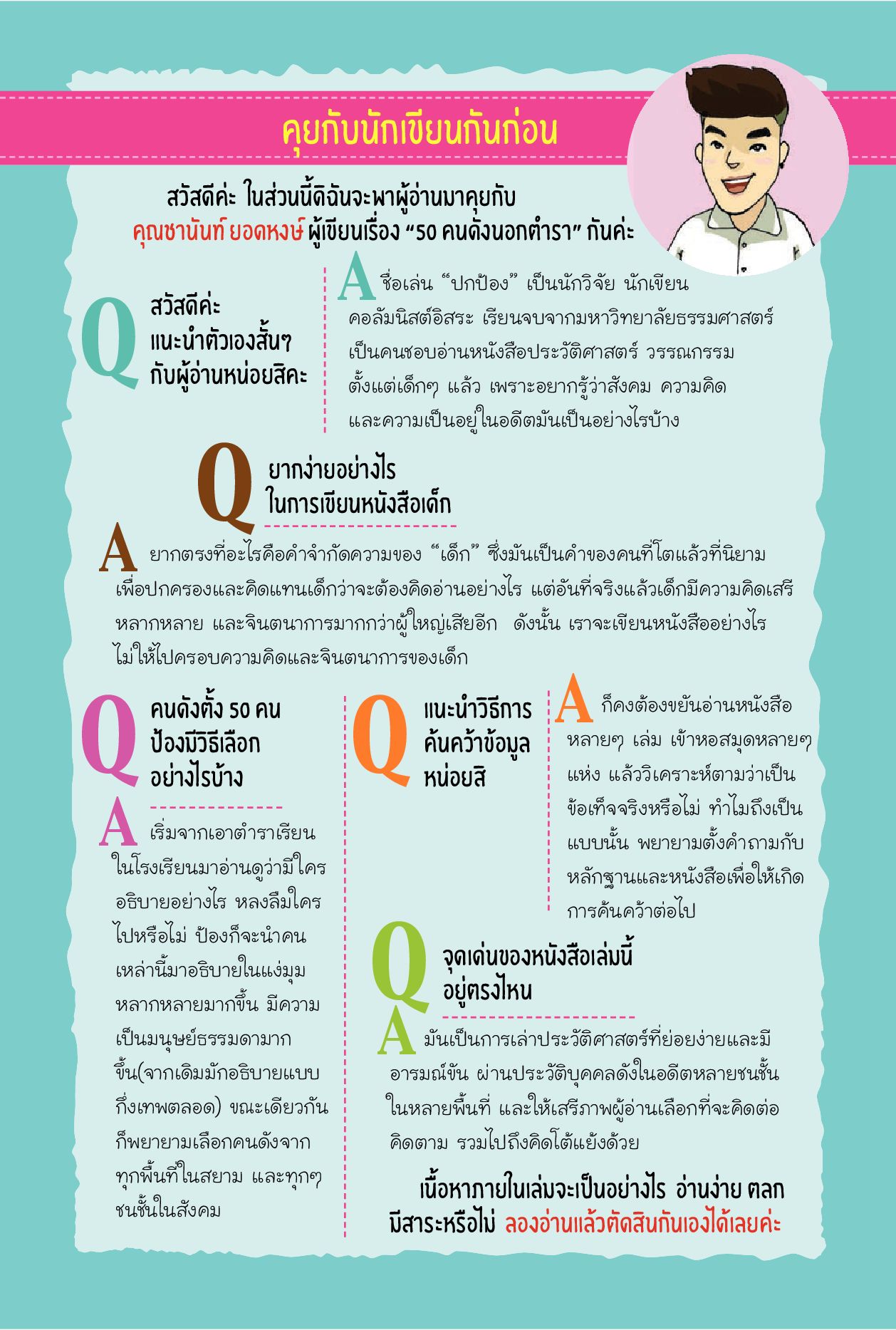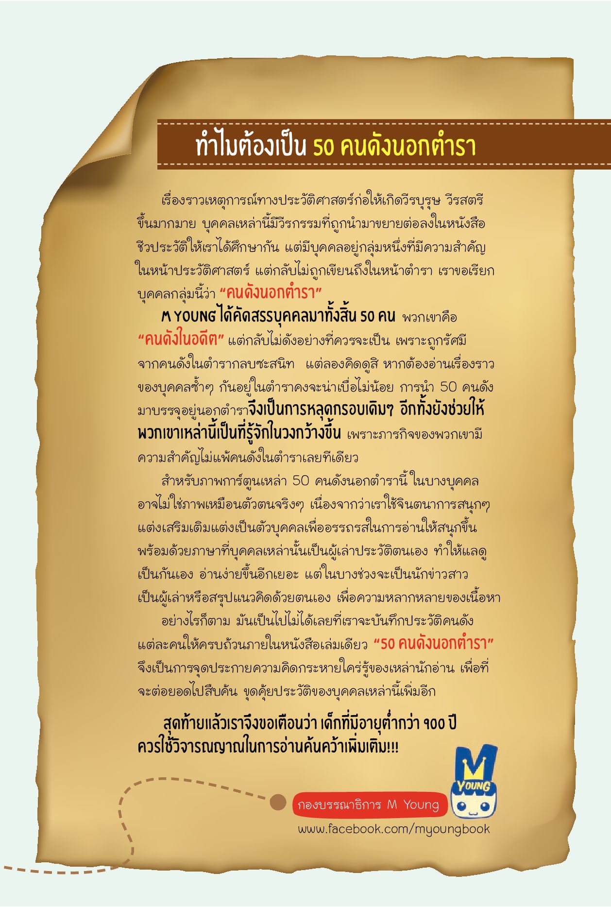หนังสือ "50 คนดังนอกตำรา" เล่มนี้ เป็นการเอาเรื่องราวของบุคคลในประวัติศาสตร์ที่มีความสำคัญ ครอบคลุมบุคคลทุกชนชั้นในสังคม ตั้งแต่ระดับกษัตริย์ จนถึงไพร่และทาส รวมไปถึงการหยิบเอาบุคคลทุกๆ พื้นที่ในสยาม ซึ่งแตกต่างจากบุคคลในตำราที่มักนิยมเล่าเรื่องของบุคคลในกลุ่มลุ่มแม่น้ำเจ้าพระยาเท่านั้น อธิบายในรูปแบบของบทสัมภาษณ์ โดยให้พวกเขาเป็นคนเล่าเรื่องราวของตัวเอง ทำให้ภาษาที่นำมาใช้อ่านง่าย สนุก และแฝงไปด้วยอารมณ์ขัน ดนดังเหล่านี้เป็นใคร มาจากไหน คุณเคยอ่านเรื่องราวของพวกเขาหรือไม่ อย่ารอช้า รีบไปรู้จักพวกเขากันเลย!