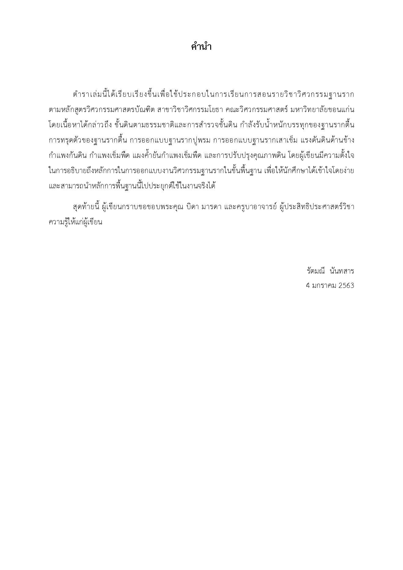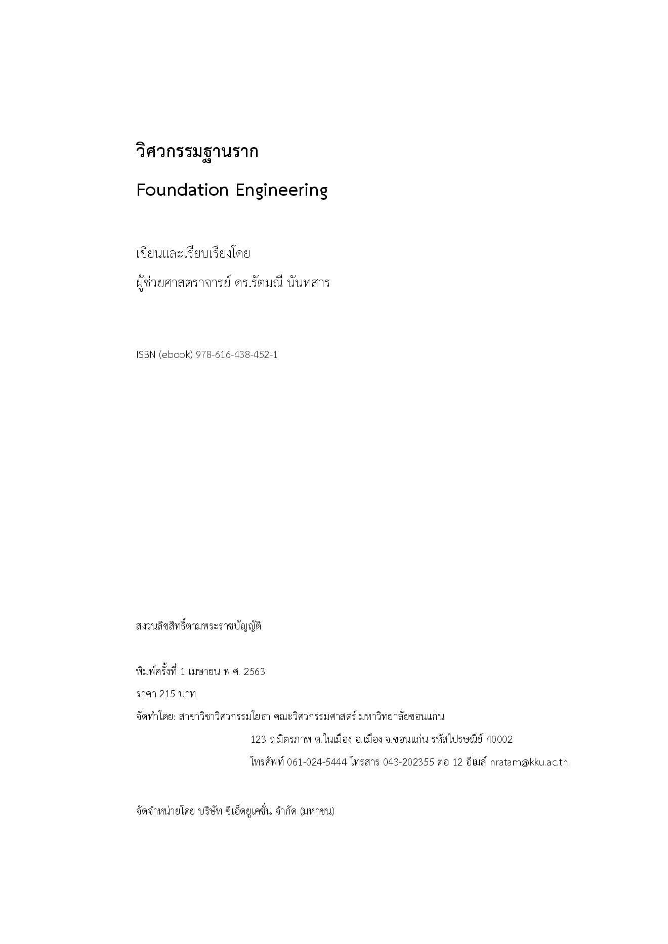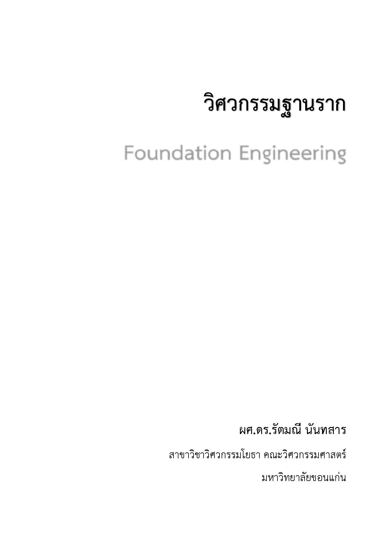 ตำราเล่มนี้ไดเรียบเรียงขึ้นเพื่อใชประกอบในการเรียนการสอนรายวิชาวิศวกรรมฐานรากตามหลักสูตรวิศวกรรมศาสตรบัณฑิต สาขาวิชาวิศกรรมโยธา คณะวิศวกรรมศาสตร์ มหาวิทยาลัยขอนแก่น โดยเนื้อหาได้กล่าวถึง ชั้นดินตามธรรมชาติและการสำรวจชั้นดิน กำลังรับน้ำหนักบรรทุกของฐานรากตื้น การทรุดตัวของฐานรากตื้น การออกแบบฐานรากปูพรม การออกแบบฐานรากเสาเข็ม แรงดันดินด้านข้างกำแพงกันดิน กำแพงเข็มพืด แผงค้ำยันกำแพงเข็มพืด และการปรับปรุงคุณภาพดิน โดยผู้เขียนมีความตั้งใจ ในการอธิบายถึงหลักการในการออกแบบงานวิศวกรรมฐานรากในขั้นพื้นฐาน เพื่อใหนักศึกษาไดเขาใจโดยง่าย และสามารถนำหลักการพื้นฐานนี้ไปประยุกต์ใช้ในงานจริงได้