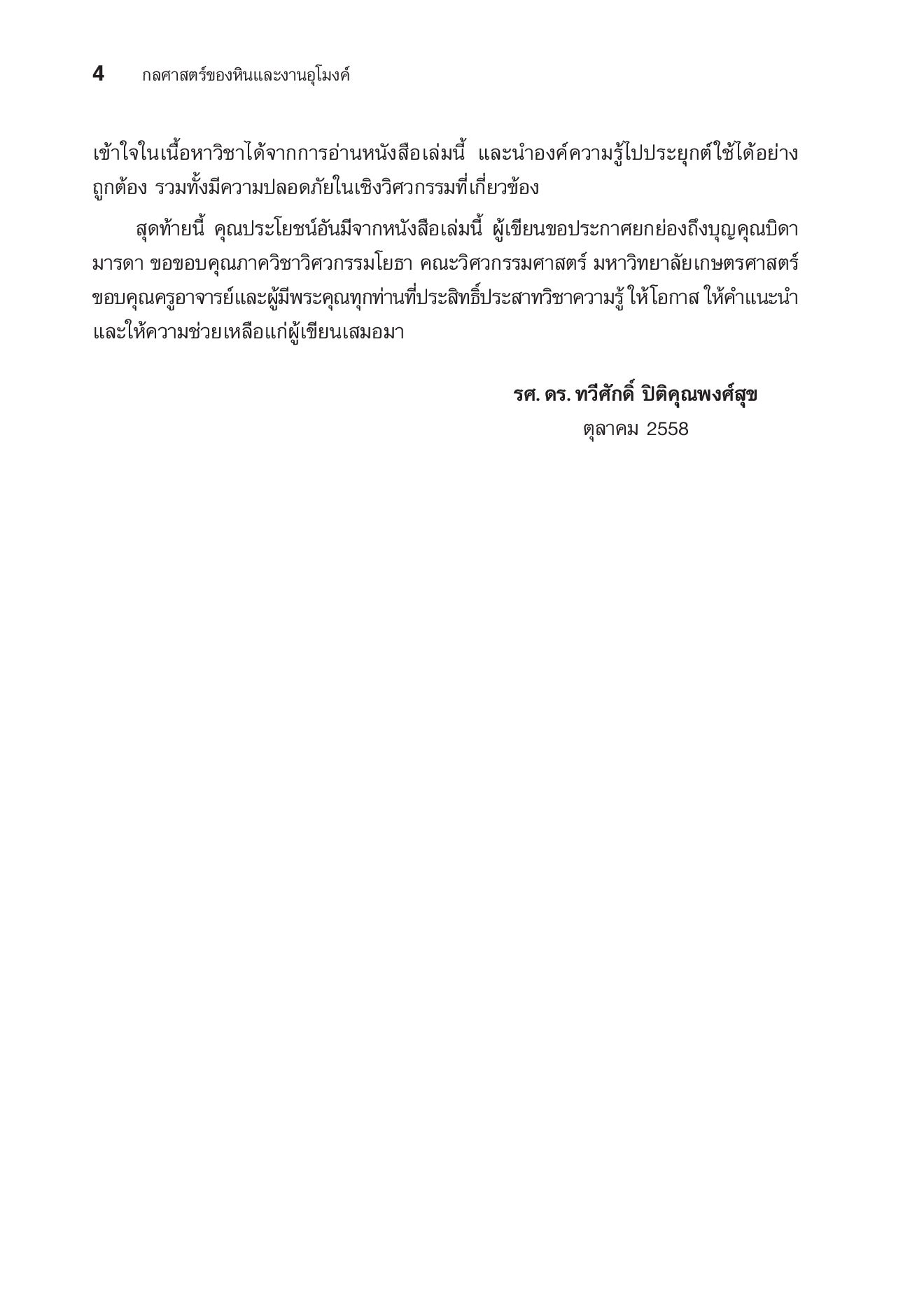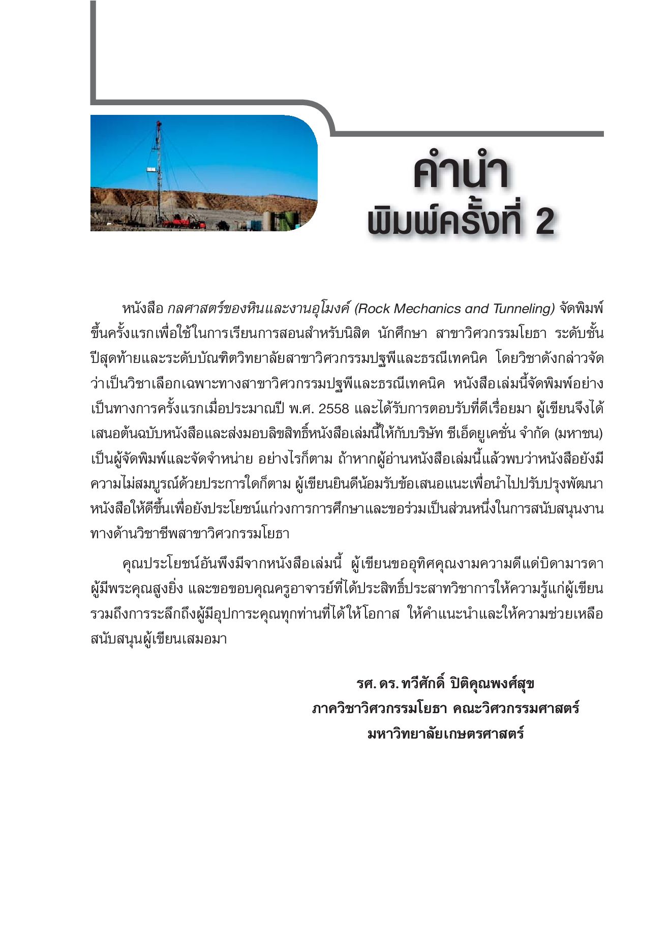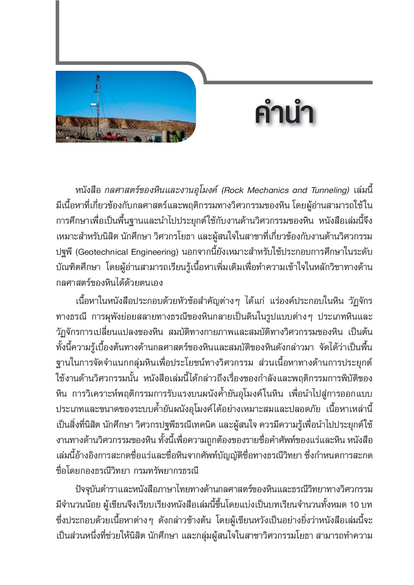 หนังสือ "กลศาสตร์ของหินและงานอุโมงค์" เล่มนี้ มีเนื้อหาที่เกี่ยวข้องกับกลศาสตร์และพฤติกรรมทางวิศวกรรมของหิน โดยผู้อ่านสามารถใช้ในการศึกษาเพื่อเป็นพื้นฐานและนำไปประยุกต์ใช้กับงานด้านวิศวกรรมของหิน เหมาะสำหรับนิสิต นักศึกษา วิศวกรรมโยธา และผู้สนใจในสาขาที่เกี่ยวข้องกับงานด้านวิศวกรรมปฐพีและธรณีเทคนิค (Geotechnical Engineering) นอกจากนี้ ยังเหมาะสำหรับใช้ประกอบการศึกษาในระดับบัณฑิตศึกษา โดยผู้อ่านสามารถเรียนรู้เนื้อหาเพิ่มเติมเพื่อทำความเข้าใจในหลักวิชาทางด้านกลศาสตร์ของหินได้ด้วยตนเอง มีเนื้อหา 10 บท ประกอบด้วย แร่ประกอบในหิน วัฏจักรทางธรณีและการเกิดดิน ชนิดของหิน สมบัติทางกายภาพของหิน สมบัติทางวิศวกรรมของหิน การจำแนกหินทางวิศวกรรม กำลังและหลักการพิบัติของหิน การก่อสร้างอุโมงค์ในหินโดยวิธี Tunnel Boring Machine การวิเคราะห์หน่วยแรงในชั้นหินและผนังอุโมงค์ รวมทั้งการวิเคราะห์และออกแบบค้ำยันผนังอุโมงค์ในหิน เป็นต้น