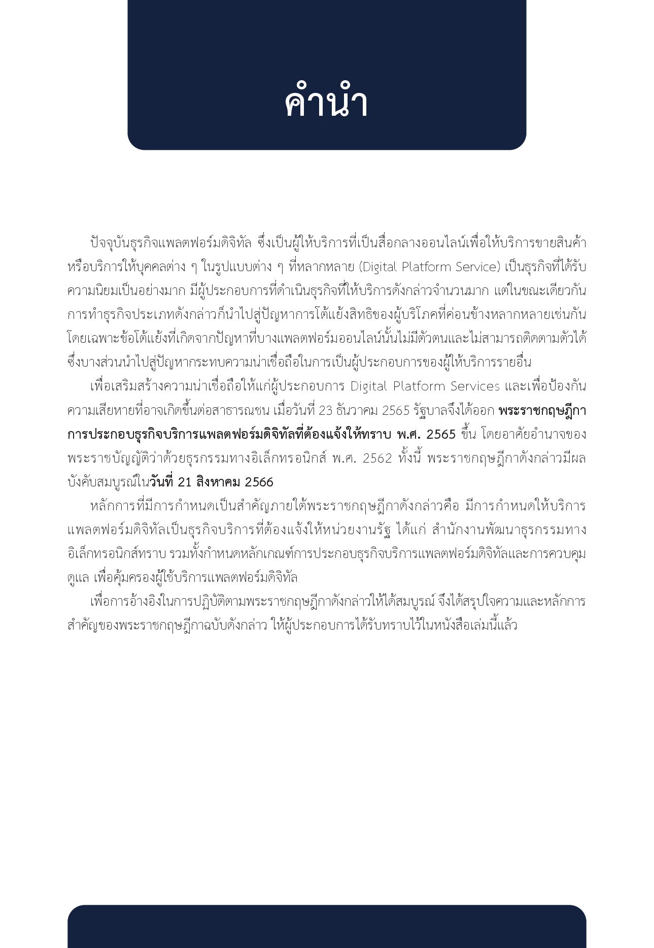 การใช้บริการผ่านเว็บไซต์หรือช่องทางแพลตฟอร์มดิจิทัลเป็นที่นิยม เพราะสะดวก รวดเร็ว แต่ก็ยังคงมีปัญหาที่พบเจอกันบ่อย ๆ เช่น สินค้าไม่ตรงปก การถูกหลอก ถูกโกง สินค้าสูญหาย โดยไม่สามารถติดตามหรือติดต่อผู้รับผิดชอบได้ เป็นต้น ดังนั้นเพื่อเป็นการเสริมสร้างความน่าเชื่อถือให้แก่ผู้ประกอบการและผู้ใช้บริการแพลตฟอร์มดิจิทัล (Digital Platform Services -DPS) รวมถึงป้องกันความเสียหายต่าง ๆ รัฐบาลจึงได้ออกพระราชกฤษฎีกาการประกอบธุรกิจบริการแพลตฟอร์มดิจิทัลที่ต้องแจ้งให้ทราบ พ.ศ. 2565 ผู้ประกอบการที่ดำเนินธุรกิจในลักษณะออนไลน์โดยเฉพาะธุรกิจแพลตฟอร์มดิจิทัล (Digital Platform Services -DPS) ซึ่งเป็นสื่อกลางเชื่อมโยงผู้ใช้บริการเป็นจำนวนมาก