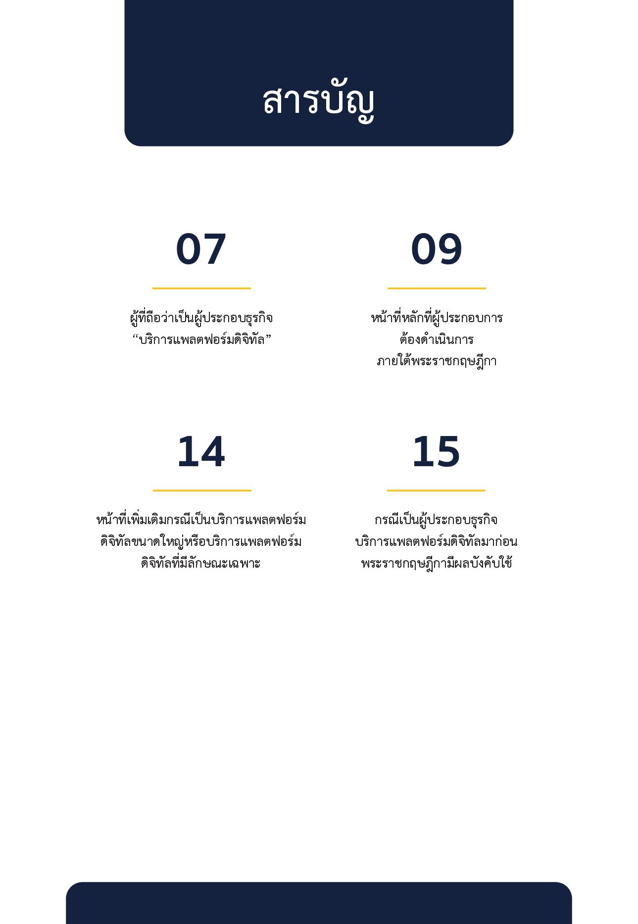 หลักการที่มีการกำหนดเป็นสำคัญภายใต้กฎหมายนี้ที่ต้องศึกษาและปฏิบัติ คือ กำหนดให้ธุรกิจให้บริการแพลตฟอร์มดิจิทัลต้องแจ้งสำนักงานพัฒนาธุรกรรมทางอิเล็กทรอนิกส์ กำหนดหลักเกณฑ์การประกอบธุรกิจบริการแพลตฟอร์มดิจิทัลและการควบคุมดูแล โดยต้องแจ้งให้ทราบถึงการประกอบธุรกิจต้องดำเนินการก่อนดำเนินการและในทุกรอบปีเพื่อคุ้มครองผู้ใช้บริการแพลตฟอร์มดิจิทัล