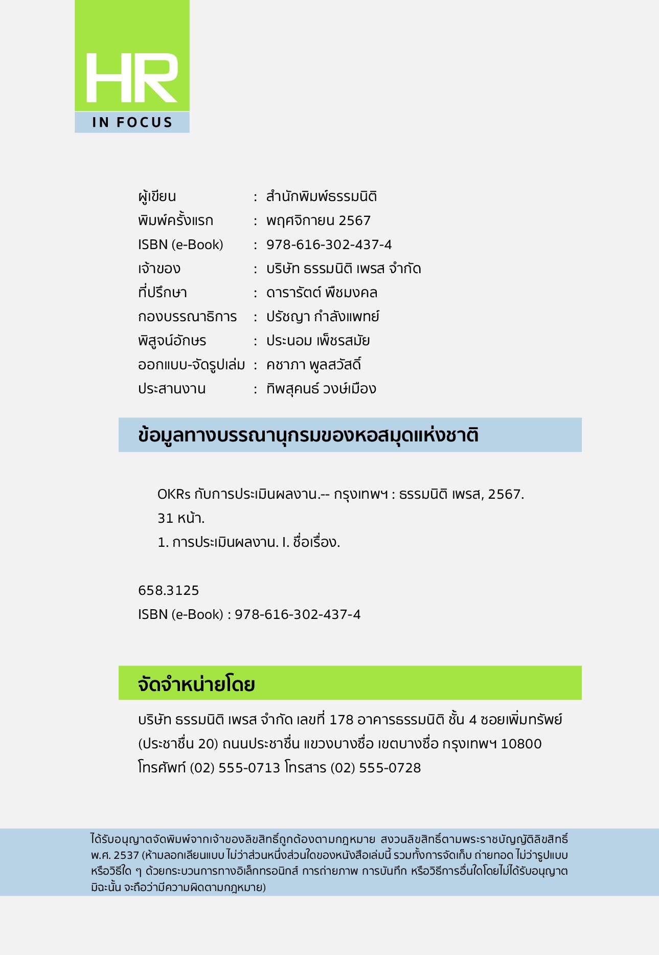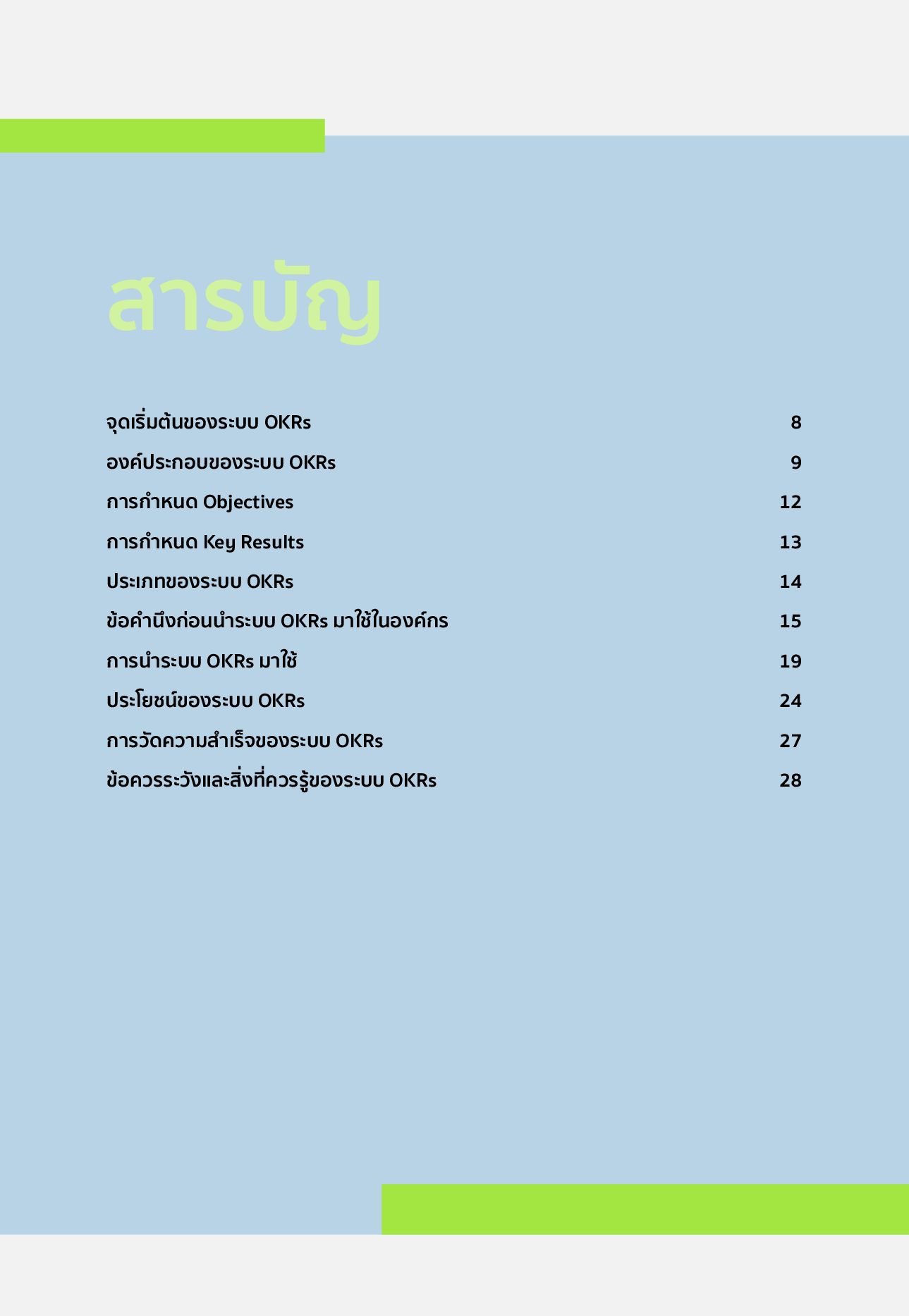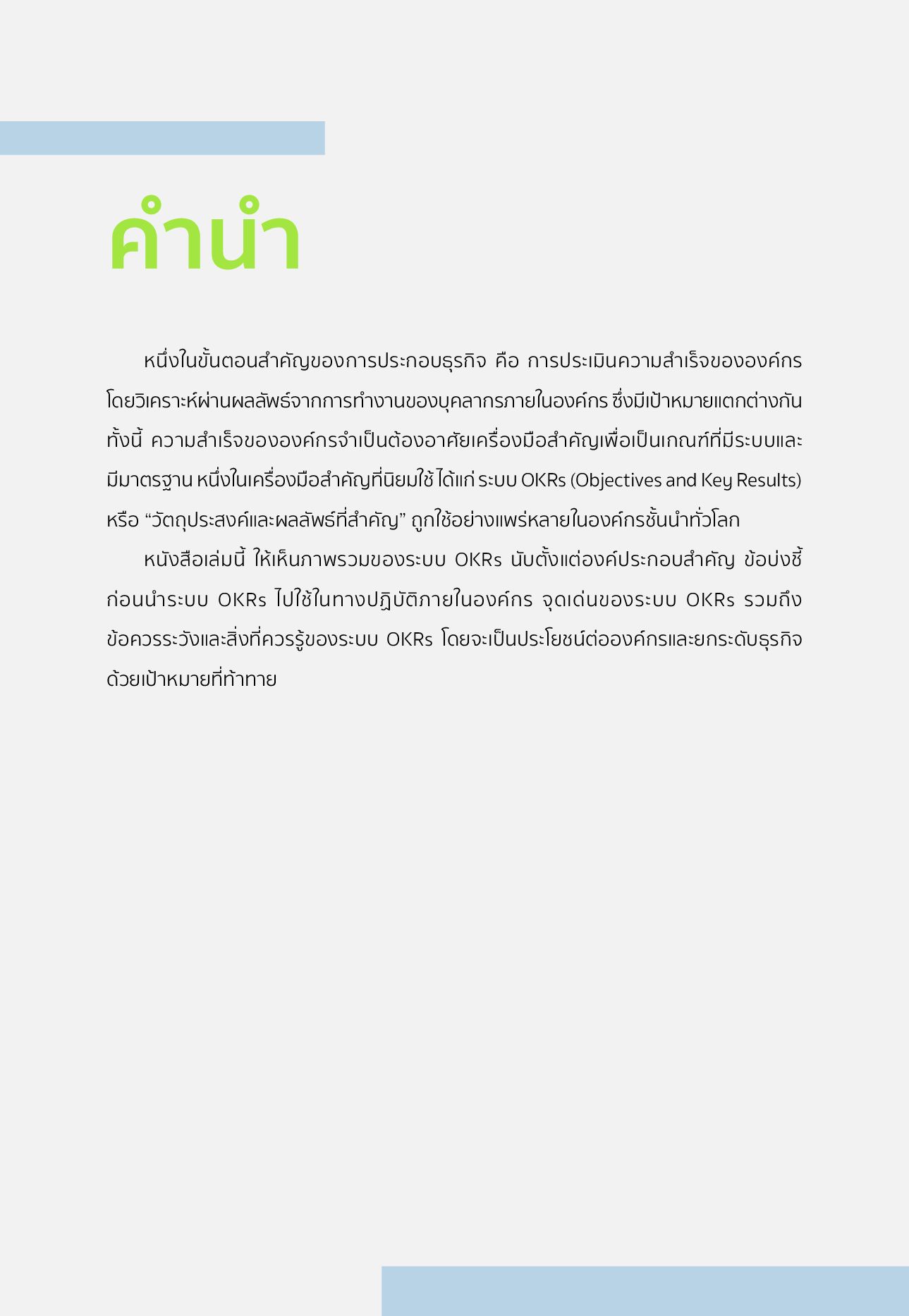 หนังสือเล่มนี้ อธิบายความเป็นมาของระบบ OKRs พร้อมเทคนิคและวิธีการออกแบบระบบดังกล่าวอย่างมีประสิทธิภาพ เพื่อองค์กรสามารถนำไปปรับใช้ให้เหมาะสมต่อธุรกิจในหลากหลายรูปแบบ